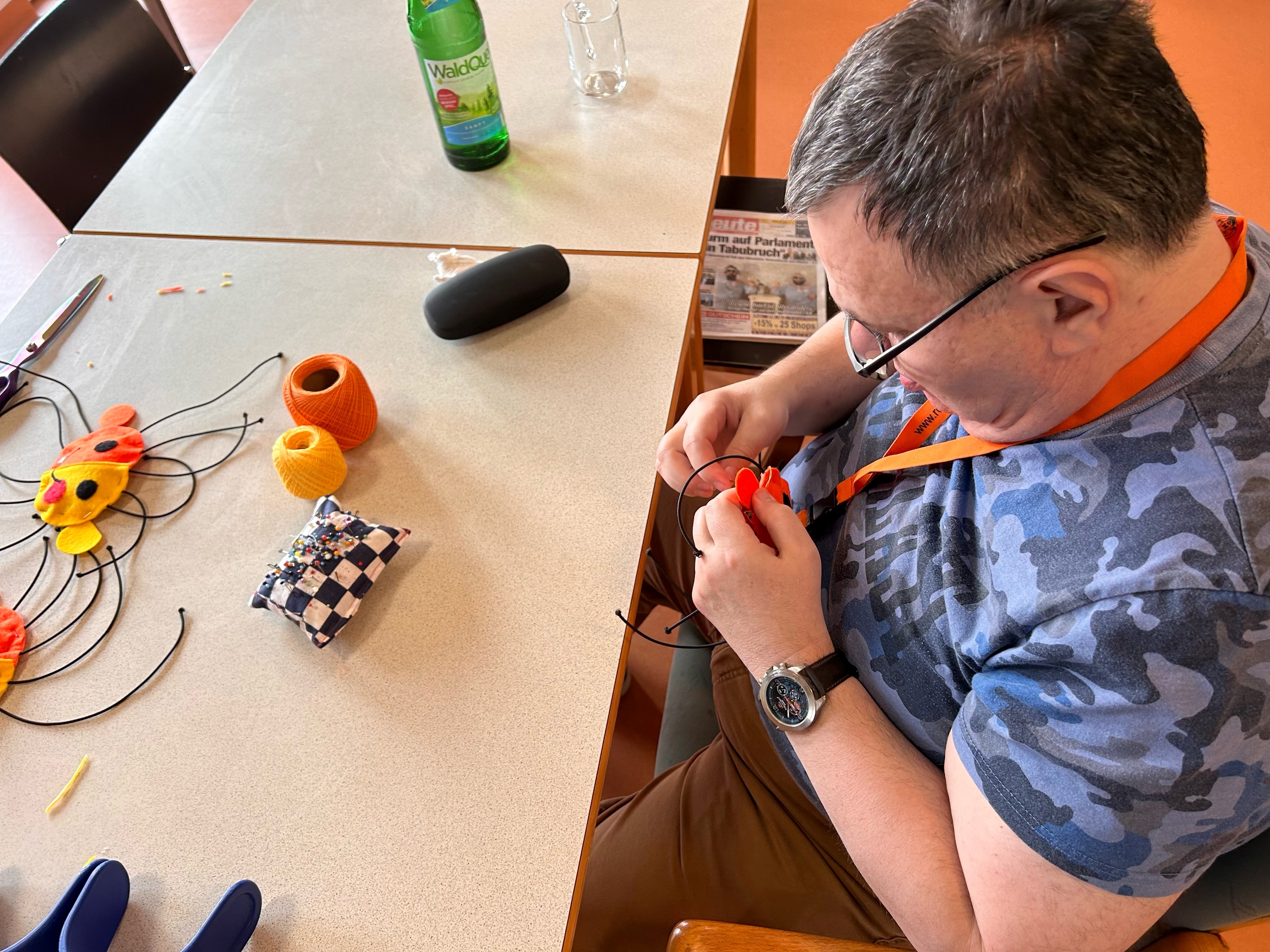 Schon öfter gab es einen Auftrag vom Verein MOKI (Mobile Kinderkrankenpflege), den die Tagesgruppe des SeneCura Sozialzentrums Frauenkirchen kreativ umsetzen konnte. So haben sich alle gefreut, als der Verein erneut mit einer Bitte an die Kreativgruppe herantrat. Die Idee für ein Maskottchen, das sich dann auch als Spielzeug für die erkrankten Kinder eignet, gibt es schon lange. Eines der betreuten Kinder hat vor Kurzem einen Entwurf angefertigt: eine orange-gelbe, lachende Sonne! Die Kreativgruppe probierte mit großem Tatendrang mehrere Techniken aus, die sich für die kreative Umsetzung des Maskottchens eigneten. Die Klientinnen und Klienten waren in die Entscheidungen eingebunden und auch beim Abstimmungsgespräch mit MOKI dabei. Schließlich wurde eine Kombination aus verschiedenen Näharbeiten gewählt. Die Klientinnen und Klienten sind mit großem Eifer bei der Sache. Diese Auftragsarbeit wird für den Verein MOKI nicht verrechnet. Die Klientinnen und Klienten spenden gerne ihre Arbeit an die Kinder, denen sie mit ihren genähten Sonnen garantiert ein Lächeln ins Gesicht zaubern.