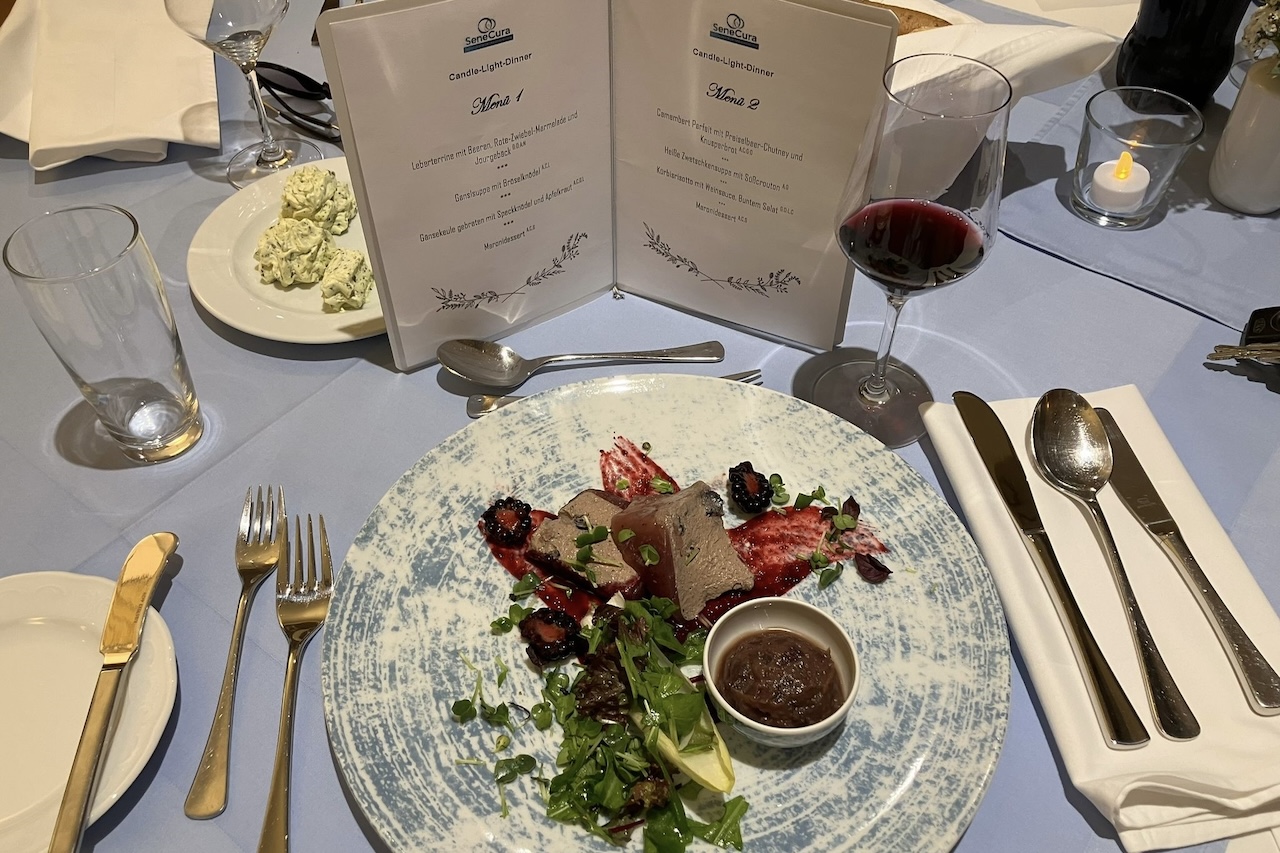 Im festlich dekorierten Speisesaal erwartete die Gäste ein Abend voller kulinarischer Köstlichkeiten. Das Küchenteam des SeneCura Sozialzentrums Frauenkirchen zauberte ein exquisit abgestimmtes 4-Gänge-Menü, das alle Sinne verwöhnte. Von der delikaten Vorspeiseauswahl, einer Leberterrine und einem Camembert Parfait über köstliche Suppenvariationen mit Ganslsuppe oder heißer Zwetschgensuppe bis hin zum kulinarischen Highlight – der gebratenen Gänsekeule – und einem Kürbisrisotto war jedes Gericht liebevoll zubereitet. Abgerundet wurde der Abend durch ein süßes Maronidessert und einer passenden Weinbegleitung, die die Aromen harmonisch ergänzte. Neben der herausragenden Qualität der Speisen trug auch die festliche Atmosphäre mit Tischdekoration, Pflanzenschmuck und sanfter Dinnermusik im Hintergrund zur besonderen Stimmung bei. „Es war ein Abend voller Genuss, und ich habe mich schon lange nicht mehr so wohl gefühlt“, erzählte Johann Soos, einer der Bewohner:innen. „Das Essen war köstlich, und die ganze Atmosphäre war einfach zauberhaft. Es hat sich angefühlt wie ein Fest im Kreise der Familie.“