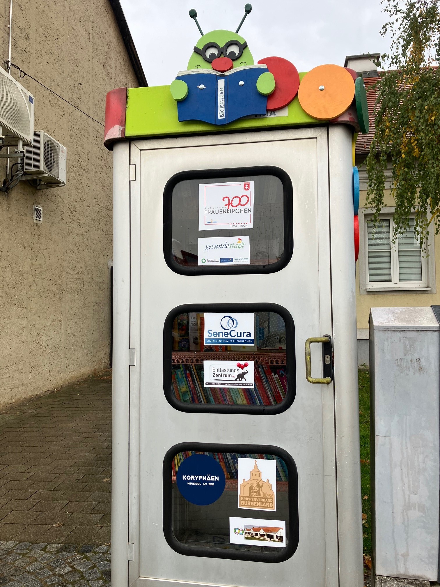 In den letzten Tagen haben die mitwirkenden Vereine an der Fertigstellung des „Bücherwurms“ gearbeitet. Der „Bücherwurm“ ist eine ausgediente Telefonzelle, die in eine Bucherausborg- und Buchtauschzentrale umgestaltet wurde. Es gibt nun dort neben vielen verschiedenen Büchern für Jung und Alt, vom Kindergarten bis zur Fachliteratur auch handgenähte Stoffsackerl zum Heimtragen der Bücher und Lesezeichen zum Pflücken. Die Sackerl hängen an einer Wäscheleine neben der alten Telefonzelle. Die Kreativgruppe des SeneCura Sozialzentrums Frauenkirchen hat die Außendekoration übernommen, die in der Bevölkerung für verzückte Reaktionen sorgte. Es gibt jetzt nun eine Bank unter dem Baum, damit man es sich mit einem Buch gleich gemütlich machen kann. Am 23. Oktober 2024 wurde die erste Frauenkirchner Bücherzelle vom Frauenkirchner Bürgermeister Hannes Schmid feierlich eröffnet.