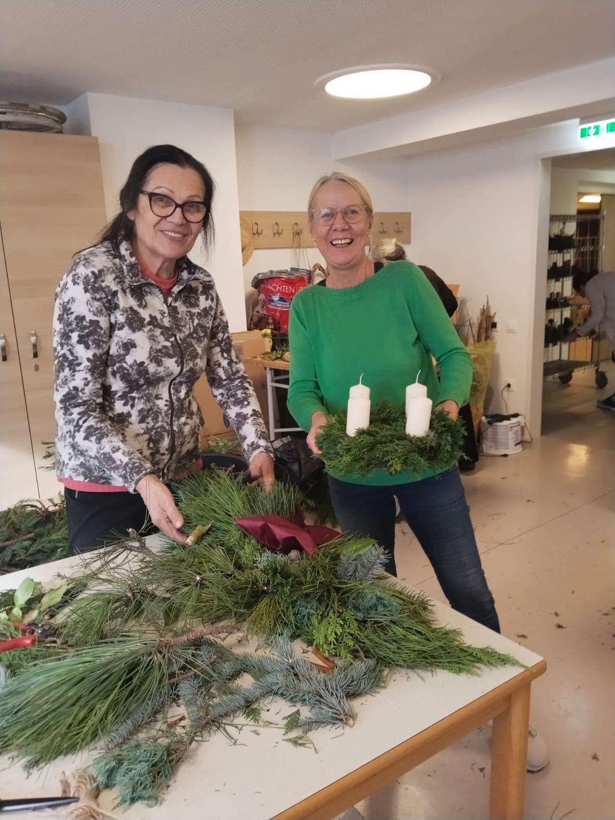 Die Angehörigen Frau Fuhrmann und Frau Thell haben große Freude mit den fertiggestellten Adventkränzen.