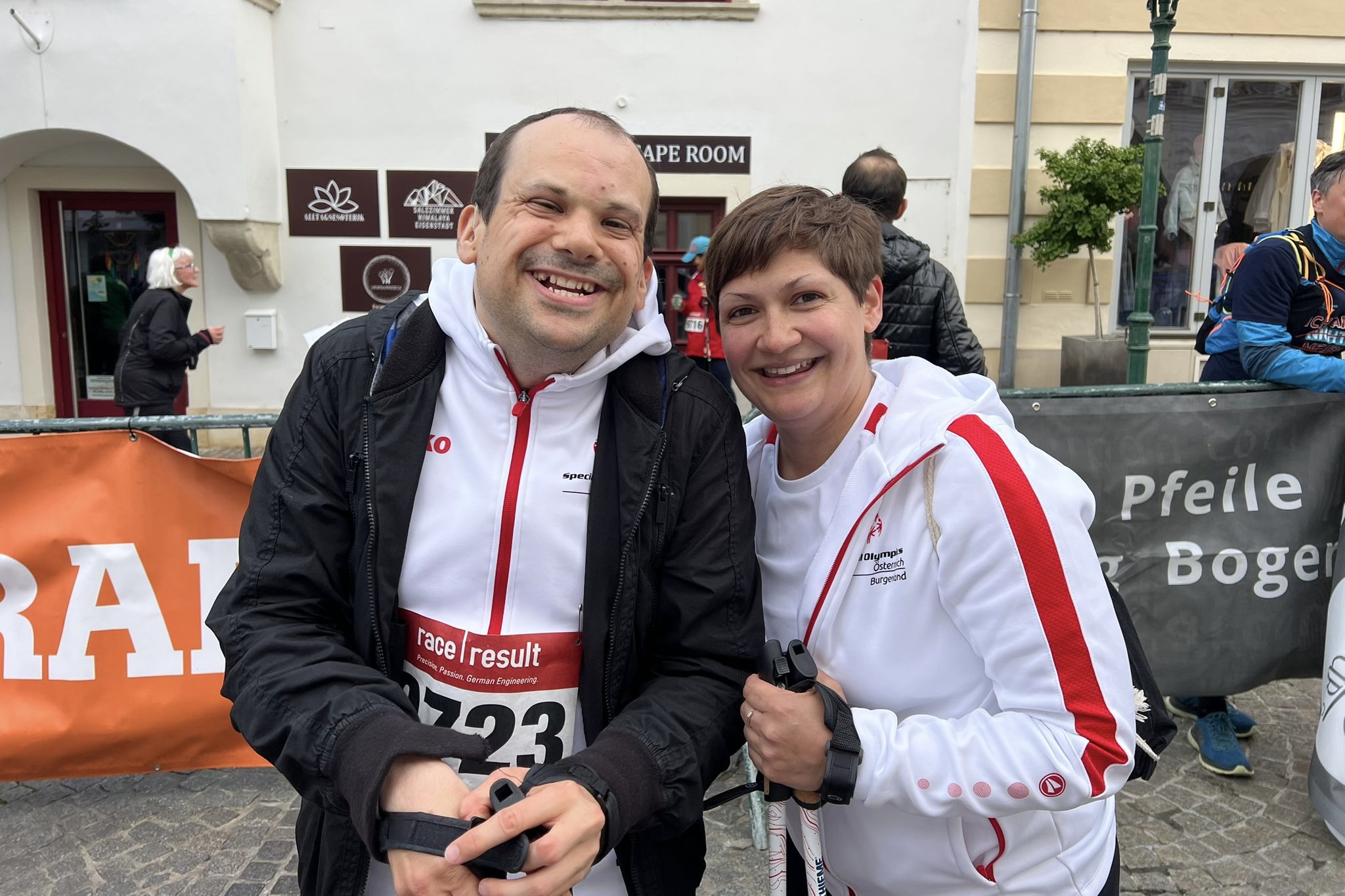 Mit über 500 Teilnehmer:innen und einer traumhaften Strecke rund um das Schloss Esterházy und durch die Altstadt war der Eisenstadt-Lauf auch heuer wieder ein Laufereignis der besonderen Art. Ein Höhepunkt: die Wertungen von Special Olympics Österreich, bei denen 50 Sportler:innen mit 33 sogenannten Unified-Partner:innen, gemeinsam an den Start gingen. Diese begleiteten jeweils eine:n Teilnehmer:in auf der Strecke – entweder beim fünf Kilometer langen Laufbewerb oder beim Nordic Walking. Auch das SeneCura Sozialzentrum Frauenkirchen stellte mit Janic Herzog (Laufbewerb) sowie Samuel Kolar und Elisabeth Millner (Nordic Walking) drei hochmotivierte Athlet:innen, die von ihren Unified-Partnerinnen Eszter Gulyas, Angelika Lendway und Sandra Thury begleitet wurden. „Ich war vorher ein bisschen nervös – aber dann bin ich einfach losgelaufen und hab die vielen Leute gar nicht mehr gemerkt. Es war wunderschön!“, erzählt Klient Janic Herzog strahlend, nachdem er eine außerordentlich gute Laufleistung erzielte. Die Stimmung am Start war elektrisierend, getragen von Applaus, Musik und der mitreißenden Vorfreude aller Beteiligten. In der festlichen Kulisse des beleuchteten Schloss Esterhazy fand anschließend die Siegerehrung statt, wo sich Klient Samuel Kolar und seine Unified-Partnerin Angelika Lendway über je eine Medaille freuen durften.