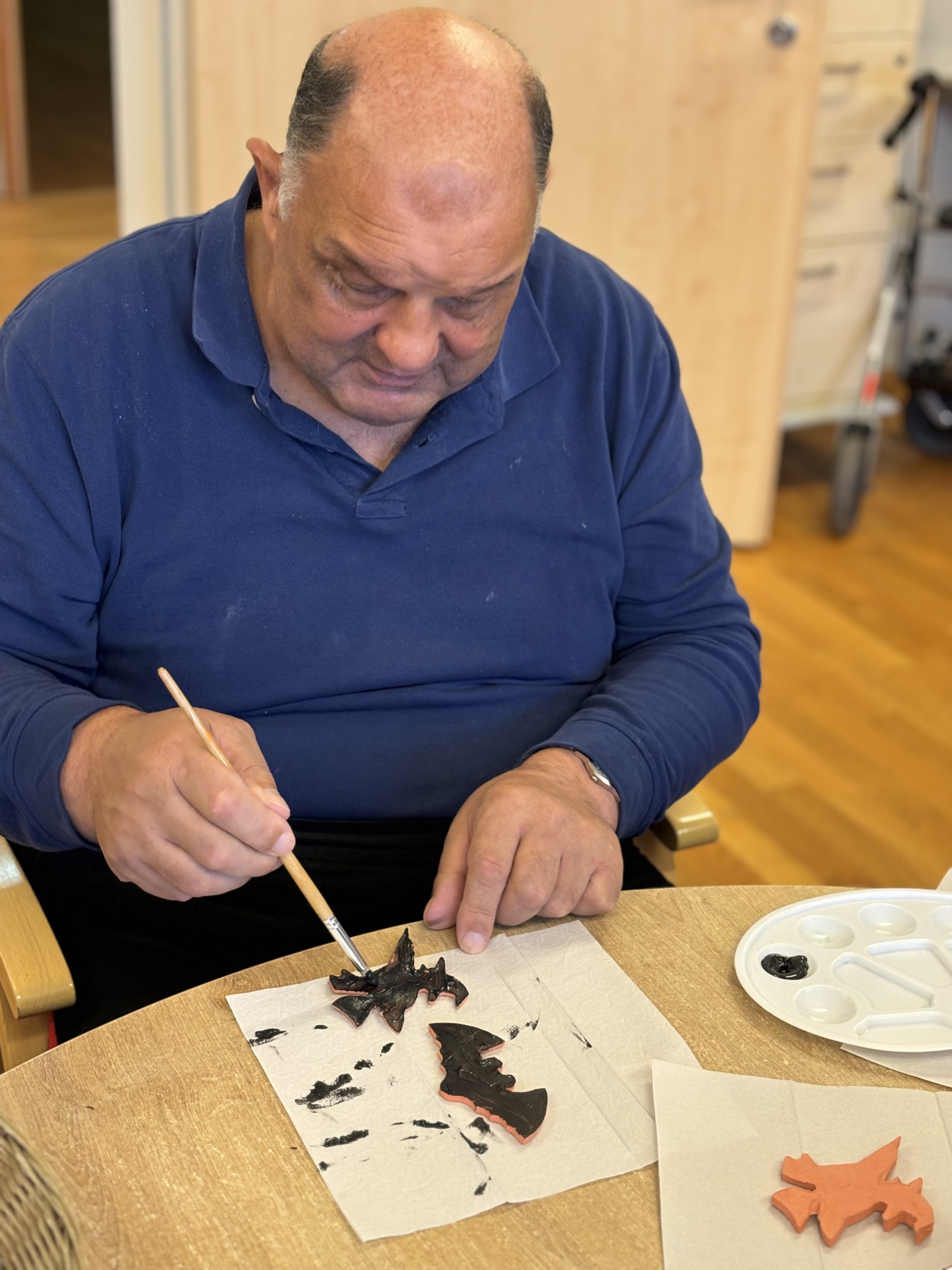 Horst Kremsner beteiligt sich mit großem Engagement und bemalt die ausgeschnittenen Fledermäuse mit schwarzer Farbe für die Raumdekoration für Halloween.