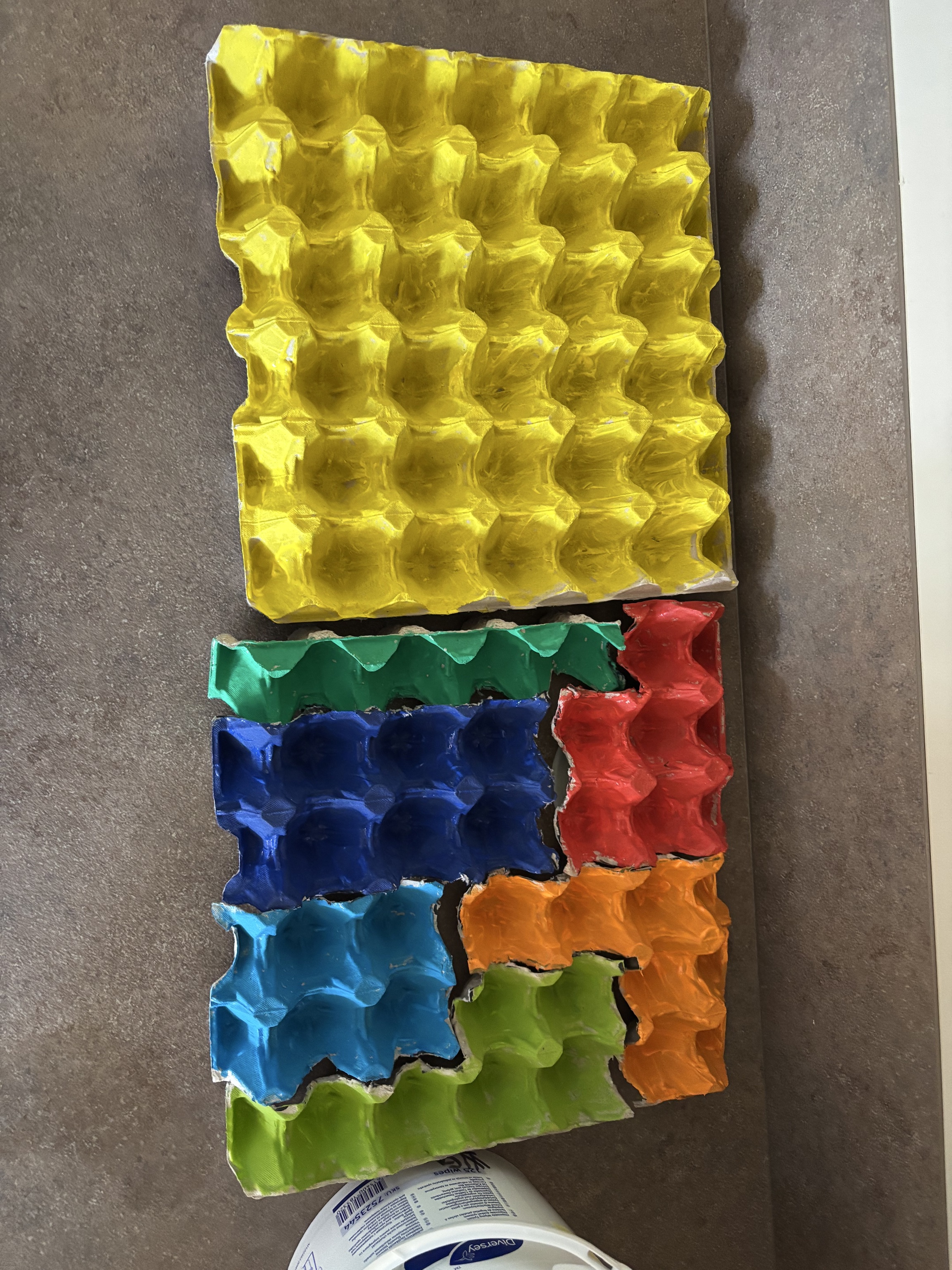 Und wenn die Farben schon am Tisch stehen, wird das Malen gleich ausgeweitet. Ganz nebenbei entstehet aus Eierkartons ein Tetris-Spiel für Senioren. So wird aus einer Mal-Aktion eine nachhaltig wirksame Aktivität. Das Tetris-Spiel wird den Senioren noch viele knifflige Momente und viel Spaß bescheren.