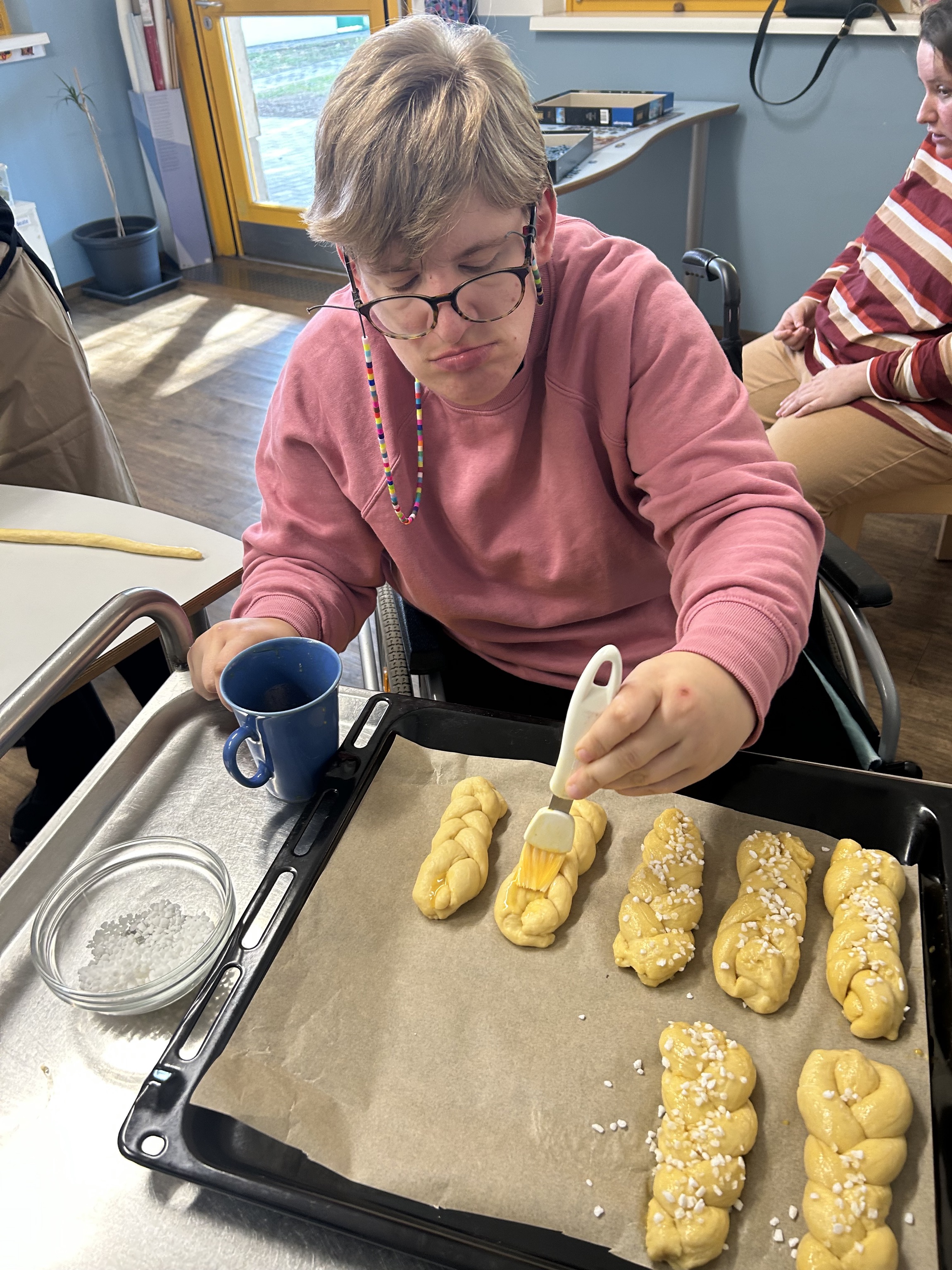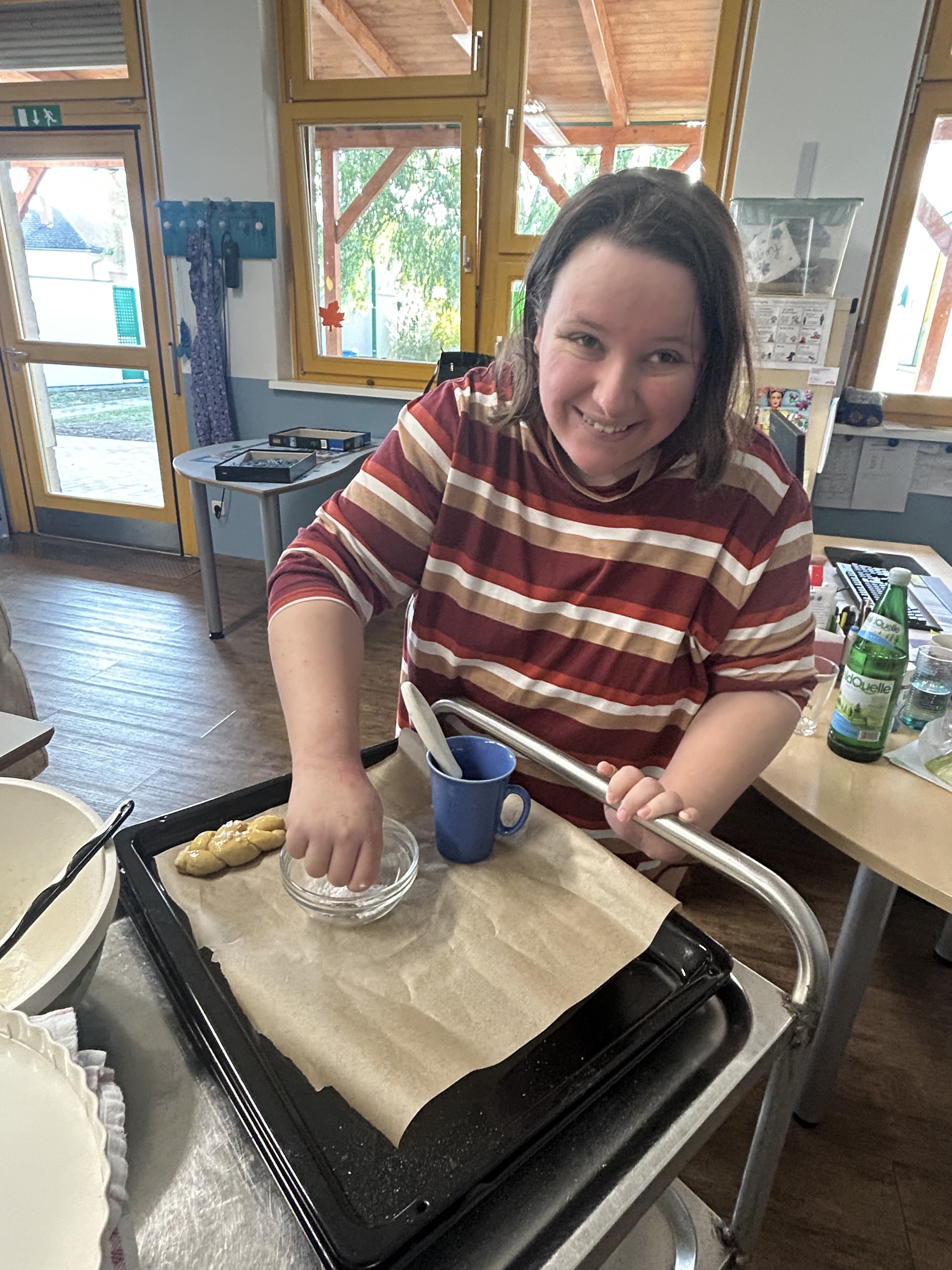 Das Vermengen der Zutaten, das Benützen der Küchenwaage, die faszinierende Arbeit der Küchenmaschine und schließlich das Flechten der Striezel ist eine Aktivität für alle Sinne. Die Klientinnen und Klienten der Tagesstätte profitieren immer davon, wenn etwas von Anfang bis zum Ende im wahrsten Sinne des Wortes „durch ihre Hände geht“.